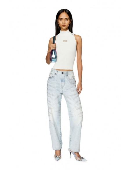 La interpretación actualizada del logotipo Oval D se convierte en un elemento central de este top, con una placa de metal cuidadosamente insertada en el recorte del pecho. Esta ingeniosa incorporación revela sutiles destellos de piel, creando un equilibrio perfecto entre la moda audaz y la elegancia discreta. El resultado es una pieza versátil que puede llevarse con confianza en diversas ocasiones, ofreciendo un toque de distinción y estilo contemporáneo en cada detalle.
