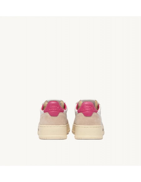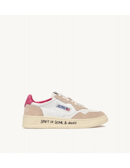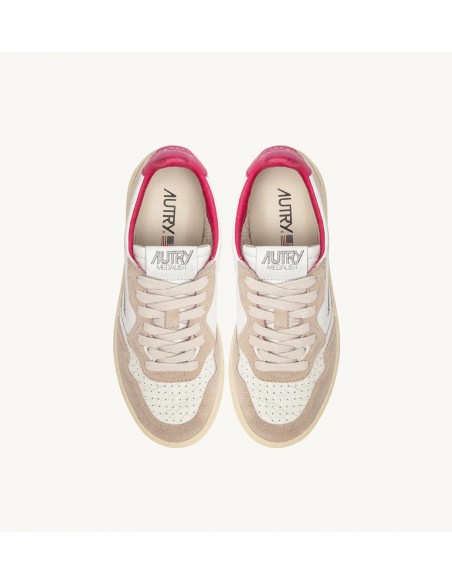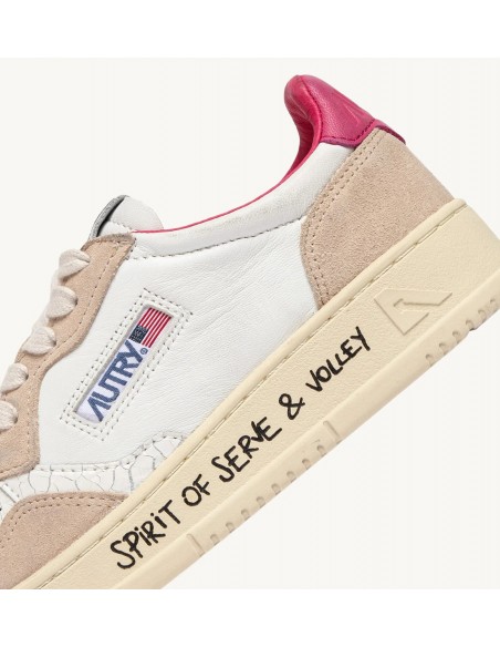 Autry Medalist, inspiradas en el diseño vintage de los años 80 reinterpretado de forma moderna, son zapatillas bajas de estilo vintage. La parte superior combina cuero blanco y ante beige, destacando el icónico logo grabado en un llamativo parche trasero en fucsia. Las especificaciones incluyen detalles como la puntera perforada en cuero craquelado, cordones planos de algodón y un cómodo cuello acolchado.
