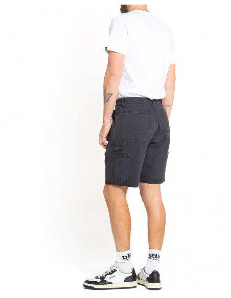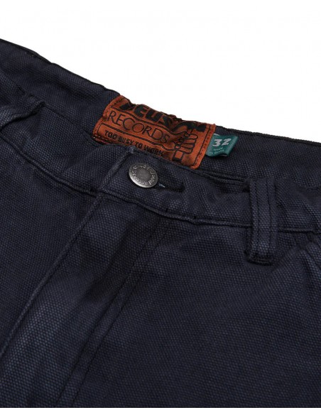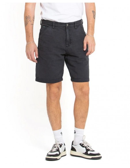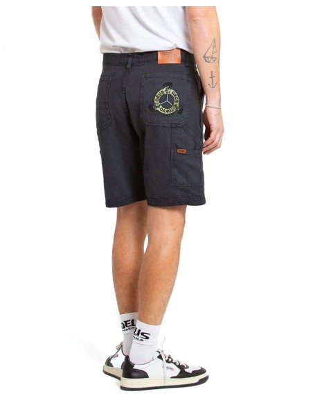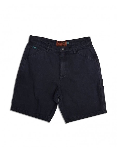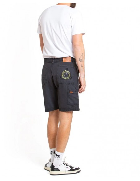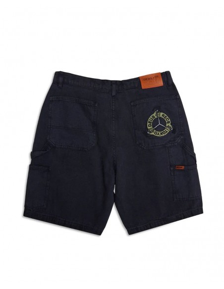 Short de ajuste relajado con cierre de cremallera y botón, bordado con arte en el bolsillo trasero, parche de cuero con marca, fabricado en lienzo orgánico pesado al 100%, teñido con prenda y lavado con enzimas pesadas.