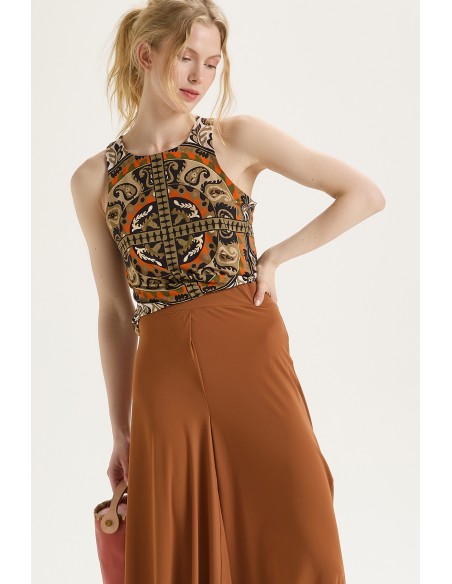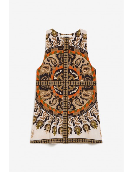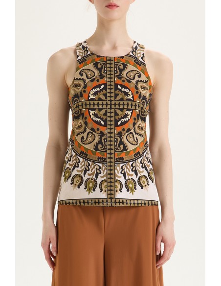 Refresca tu estilo con nuestro top canotta en suave jersey ultraligero con una encantadora estampa de motivo foulard. Este top es la elección perfecta para lucir elegante y sentirte cómoda durante todo el día. Confeccionado en un tejido suave y ligero, este top te mantendrá fresca y cómoda en los días más cálidos. La estampa de motivo foulard añade un toque de sofisticación y estilo a tu look, mientras que el corte canotta ofrece un ajuste favorecedor y versátil. Ya sea que lo combines con unos pantalones de vestir para un look más formal o con unos jeans para un estilo casual de fin de semana, este top es una opción versátil que te acompañará en cualquier ocasión.