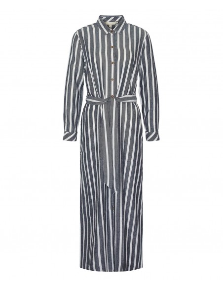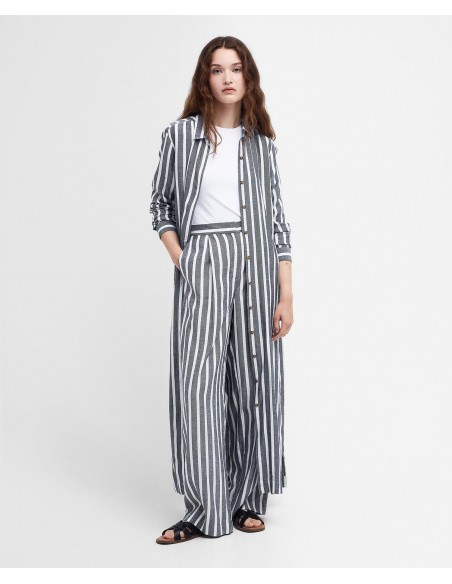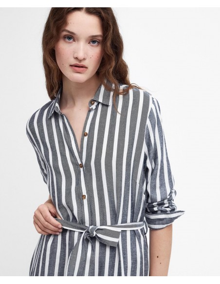 Dale un toque de elegancia a tu estilo diario con una versión estacional de la sastrería moderna. El Vestido Camisero a Rayas Barbour Annalise ha sido confeccionado con una ligera mezcla de lino, lo que lo hace ideal para los meses más cálidos del año. Su silueta inspirada en camisa lo hace versátil, perfecto para combinar tanto con zapatillas como con sandalias, creando así un look smart-casual que destaca en cualquier ocasión.