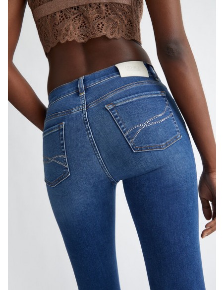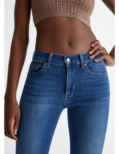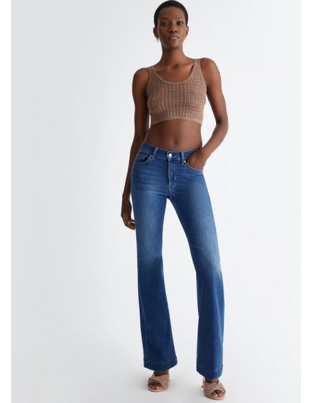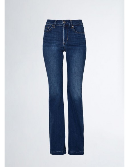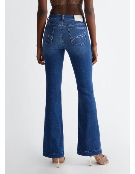Vaqueros en denim de algodón elástico, Lavado de efecto desgastado, Pinza cosida, Talle alto, Bolsillos en los laterales y en la parte trasera, Pernera acampanada, Cierre con cremallera oculta, Accesorio de cadena con logotipo de LJ.