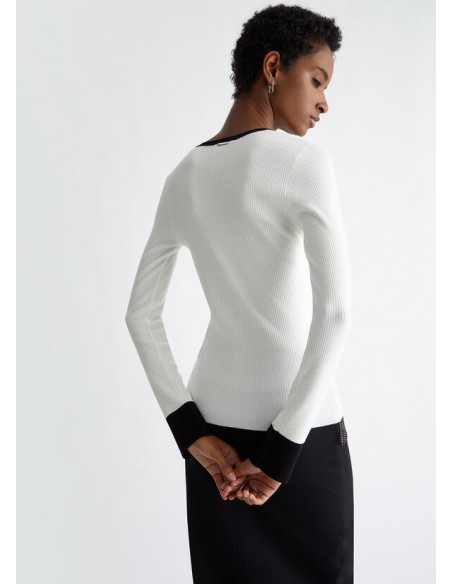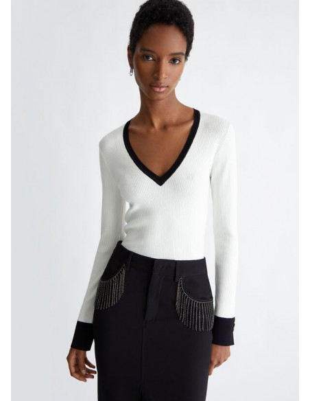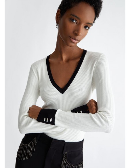 Jersey en canalé en mezcla de viscosa, Escote de pico, Manga larga, Aplicaciones de strass en los puños, Minilogotipo metálico en la parte trasera, Producto "Liu Jo Better".