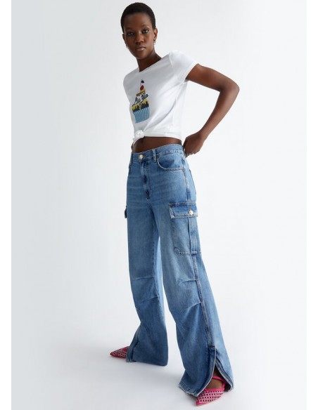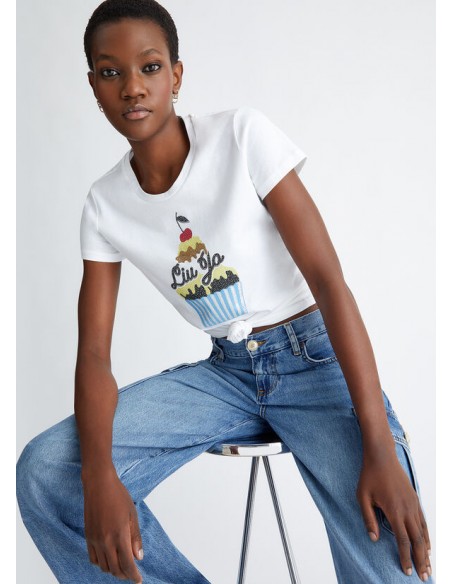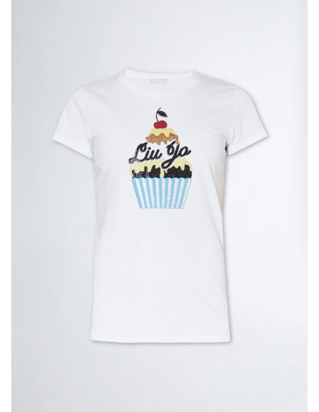 Camiseta de tejido de punto de algodón, Estampado gráfico "Cupcake" con strass, Escote redondo, Manga corta, Producto "Liu Jo Better".