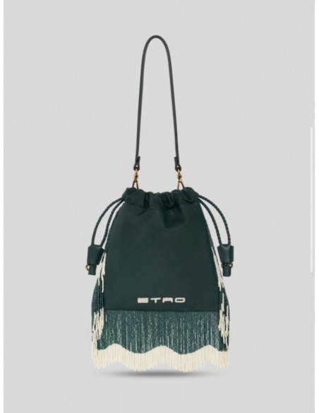 El Bolso Kalispera pequeño de Etro es una pieza única que combina lujo y espíritu artesanal. Confeccionado en piel de cordero de alta calidad, este bolso de formato saco se adorna con un delicado bordado floral de microperlas que se extiende hasta los largos flecos laterales, creando un movimiento elegante y distintivo. Su cierre de cordón trenzado mantiene seguro el contenido, mientras que el asa extraíble permite llevarlo cómodamente en la mano o al hombro, adaptándose a cualquier ocasión especial. Este accesorio exclusivo fue presentado en la pasarela primavera-verano 2025, destacándose como una joya de la colección.