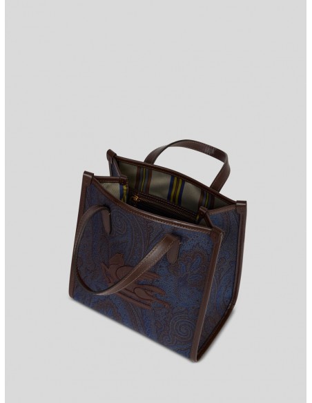 El Bolso Love Trotter pequeño de Etro destaca por su icónico tejido jacquard con motivo Paisley en tonos azules, una muestra de elegancia y tradición. Confeccionado en algodón revestido con grano mate, este bolso combina estilo y resistencia. Sus acabados en piel de becerro aportan un toque de lujo, mientras que el parche bordado con el monograma de Etro y el Pegaso en el frente añade personalidad y distinción. Con dos asas para llevarlo de mano y una correa extraíble y ajustable para el hombro, ofrece versatilidad para cualquier ocasión. En su interior, cuenta con un práctico bolsillo con cremallera para organizar tus objetos personales.