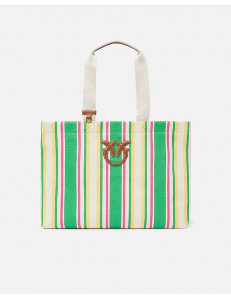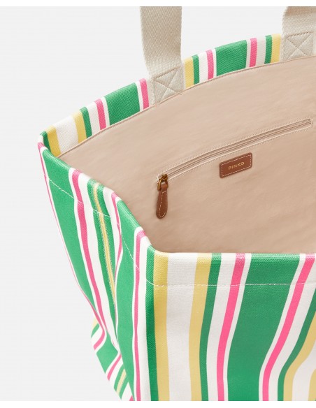 El Bolso Maxi Shopper Rayas Verde Multicolor de PINKO en tejido de algodón jacquard con diseño de rayas verticales multicolor es el bolso ideal para acompañarte en tus looks de verano. Con un diseño llamativo y alegre, este bolso tipo shopper combina funcionalidad y estilo icónico.