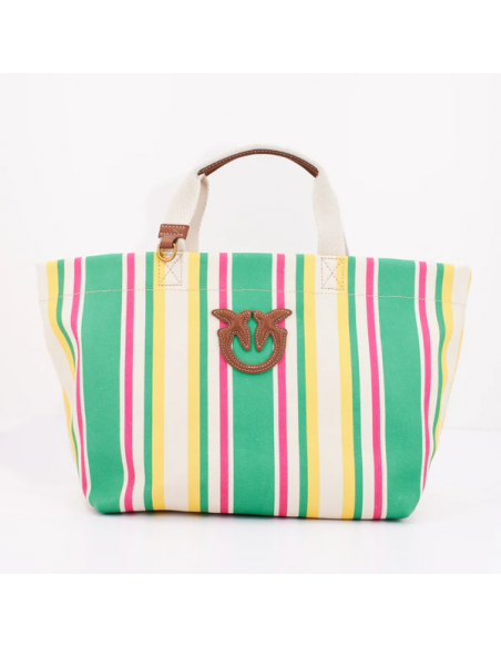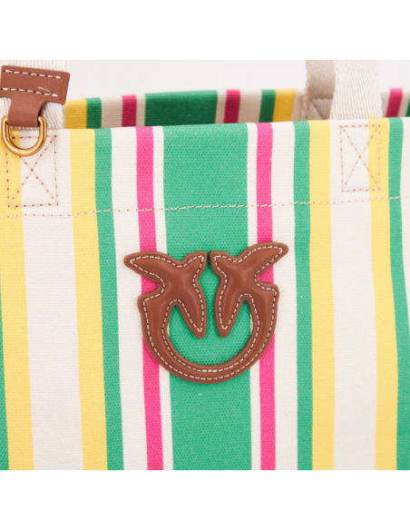 El bolso shopper mediano de Pinko es la elección perfecta para quienes buscan un complemento práctico y con estilo para los días soleados. Realizado en lona de algodón jacquard con un diseño a rayas multicolor que evoca el espíritu veraniego, este bolso añade un toque alegre y sofisticado a cualquier look. Equipado con doble asa superior acabada en piel, permite llevarlo cómodamente en la mano o al hombro. En la parte delantera, destaca el emblemático logotipo Love Birds en relieve, mientras que el interior, completamente forrado, incluye un bolsillo plano con cremallera para mantener tus objetos organizados y seguros. Ideal para acompañarte en escapadas a la playa, paseos por la ciudad o días de descanso bajo el sol.