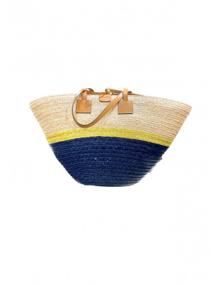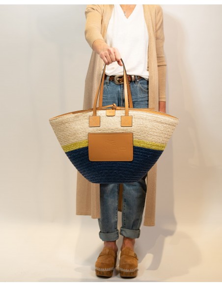 Este capazo grande en tres colores acaparará todas las miradas este verano. Su confección en paja dividida en tres colores presenta detalles en piel como son sus asas o el adorno frontal con el logo de Etro. El interior del boloso se encuentra embellecido con un forro multicolor. Cuenta con cierre de lazos que le otorga una acabado perfecto