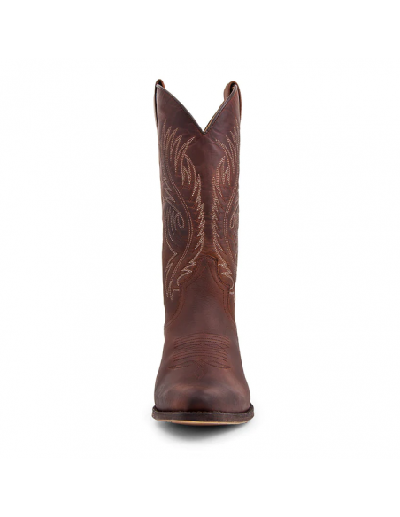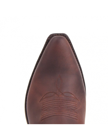 Bota vaqueras con punta no muy exagerada, en piel marrón, tacón semicubano y fabricación goodyear. Este modelo lleva más de 25 años de historia, lo que asegura su comodidad y resistencia.
