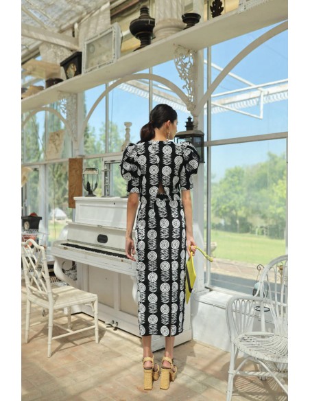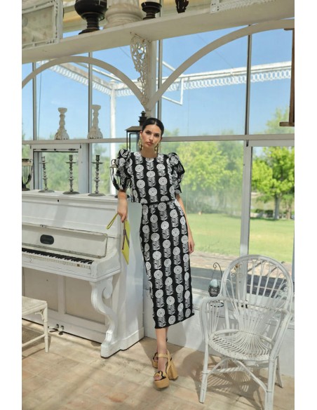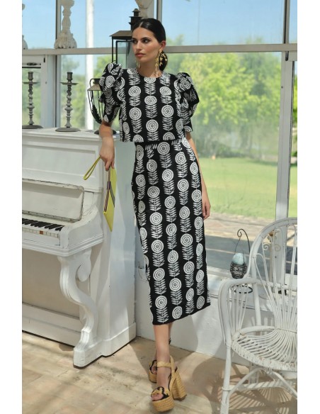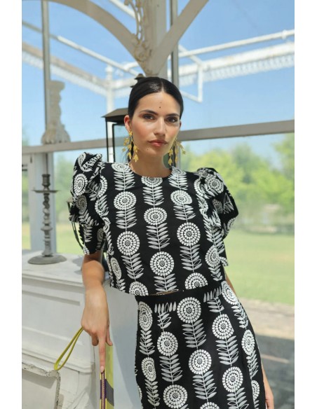 Este top de manga corta es una pieza clave para un look elegante y versátil. Su diseño presenta un estampado floral bordado en blanco sobre fondo negro y volumen en los hombros, creando un efecto sofisticado. El corte ligeramente holgado permite combinarlo fácilmente con pantalones de tiro alto o faldas ajustadas, adaptándose a diferentes estilos y ocasiones.