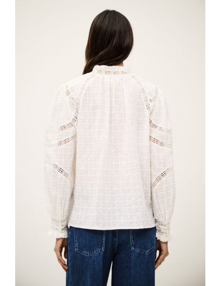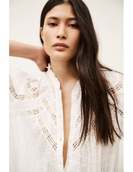 La camisa Brona de Ba&SH es una prenda que fusiona la sofisticación con detalles únicos. Con puños en las mangas que añaden estructura y elegancia, esta camisa se distingue por sus bordados delicados que aportan un toque artesanal.