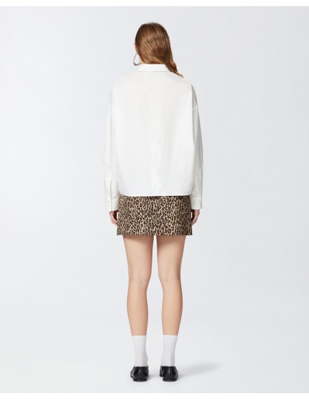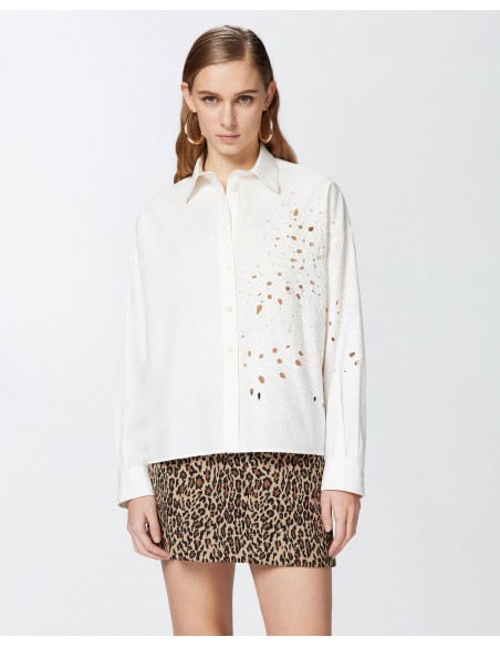 La camisa de mujer con encaje inglés y cristales de Pinko transforma una silueta clásica en una prenda llena de sofisticación y carácter. Confeccionada en popelina de algodón 100%, esta camisa de corte cuadrado ofrece estructura sin perder comodidad ni fluidez.