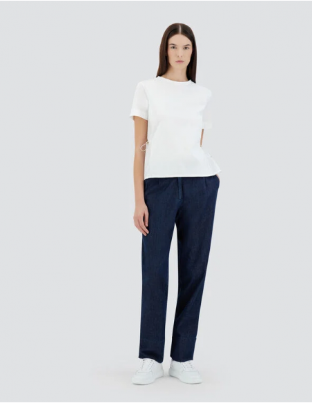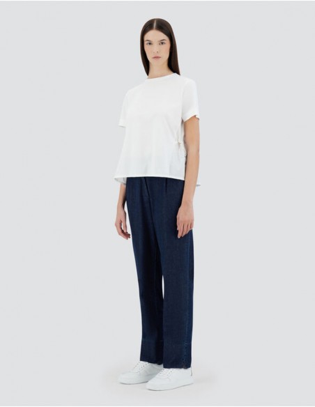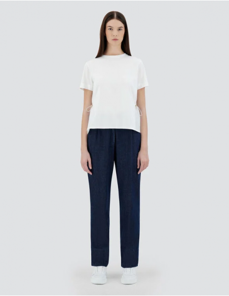 La camiseta de Chic Cotton y New Techno Tafetán de Herno ofrece una reinterpretación sofisticada del estilo casual. Confeccionada en puro algodón de acabado liso y estructurado que recuerda al neopreno ligero, presenta un diseño femenino con cordón de ajuste en la cintura, que crea un delicado volante en el bajo. La parte trasera, en tafetán técnico hidrorrepelente con acabado ligeramente iridiscente, aporta un contraste moderno y funcional. Su corte regular, mangas cortas y cuello redondo garantizan comodidad y versatilidad.