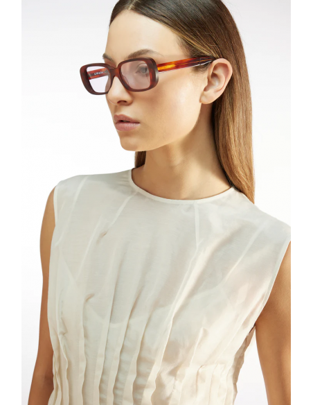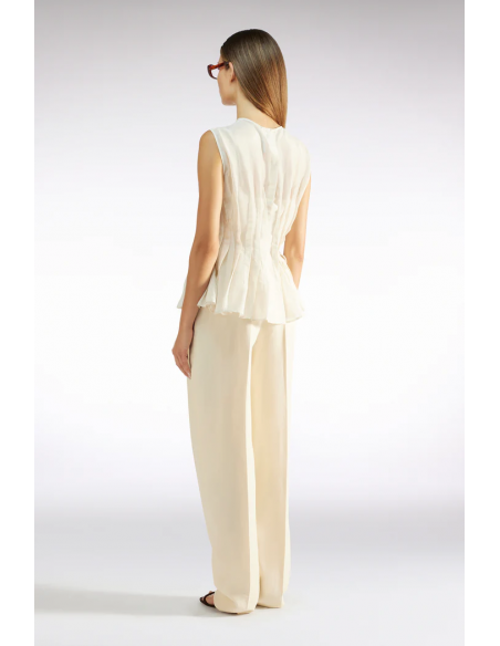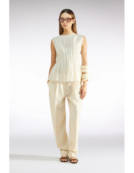 El top Ivonne de Liviana Conti es una prenda de líneas puras y sofisticadas, confeccionada en un delicado voile de algodón y seda que aporta una sensación de ligereza y elegancia natural. Su diseño sin mangas con cuello redondo y detalle de ribbings irregulares le otorga un carácter contemporáneo y refinado.