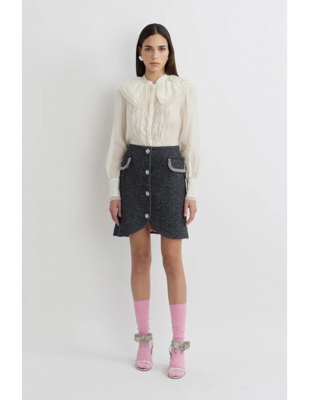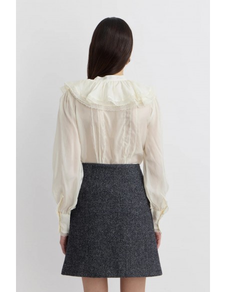 La Camisa Lace de Manoush es una blusa fluida y sofisticada, confeccionada en 70% viscosa y 30% seda, que garantiza suavidad y una caída elegante. Su cuello tipo capa aporta un toque contemporáneo, mientras que los detalles de encaje añaden delicadeza y refinamiento a la silueta.