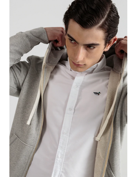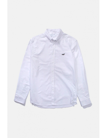 Esta camisa de manga larga abotonada está confeccionada con un tejido procedente de Portugal. Este particular tejido de Portugal está hecho de algodón. Esta camisa ofrece un acabado limpio a la vez que transmite una sensación de facilidad y comodidad. Destaca por el pequeño pato bordado en el pecho como elemento diferenciador.