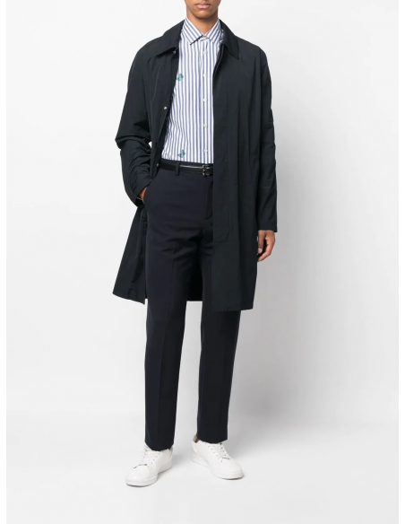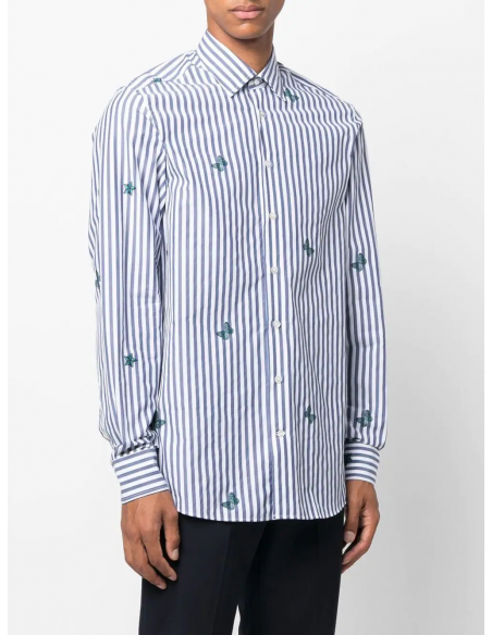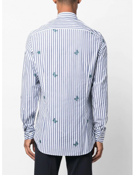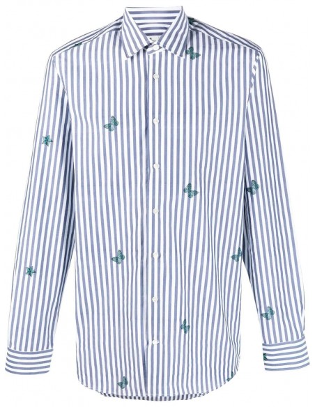 La camisa más especial de esta temporada, se diferencia de las demás por los detalle de mariposa bordadas en toda la camisa. Cuenta con reflejos azul marino en el estampado de rayas. Diseñada con cuello clásico, manga larga y cierre frontal con botones.