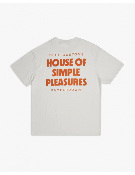 Esta camiseta es un básico que no puede faltar, presenta un diseño simple pero elegante con el texto "House of Simple Pleasures" impreso en la parte trasera. Confeccionada en un tejido suave y cómodo, es una prenda versátil y fácil de combinar que se adapta a cualquier estilo.