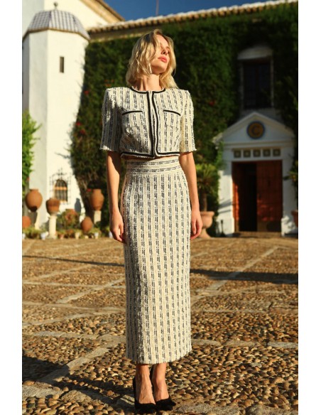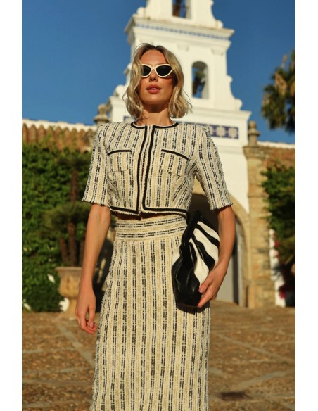 Esta camisa efecto chaqueta de tweed es una pieza clave para un look elegante y estructurado. Su tejido de tweed, mangas hasta el codo y ribetes en contraste le dan un toque clásico y sofisticado. Perfecta para combinar con la falda Tulín a juego o para añadir un toque de distinción a pantalones o faldas sencillas.