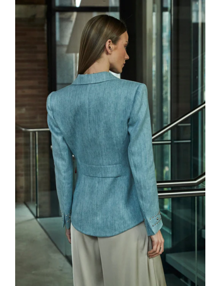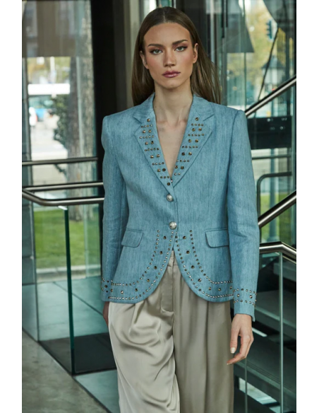La Blazer Tachas Denim Chiara de The Extreme Collection es una prenda que redefine la sastrería clásica. Confeccionada artesanalmente en España a partir de denim europeo certificado como sostenible, esta blazer combina la resistencia del lino y el algodón con la estructura que aporta el poliéster, logrando un equilibrio perfecto entre estilo y funcionalidad. Su diseño semi levita, ligeramente más largo en la parte trasera, aporta una silueta sofisticada y favorecedora. La solapa de muesca y los bolsillos de tapeta inclinados crean una línea impecable, mientras que las tachas plateadas añaden un toque de carácter y rebeldía refinada. El cierre frontal de dos botones completa su elegancia estructural. Destacan especialmente los detalles en las bocamangas, acabadas con tres hileras de tachas que refuerzan el espíritu exclusivo de la prenda. El patrón entallado con hombros bien definidos y mangas ligeramente cortas.