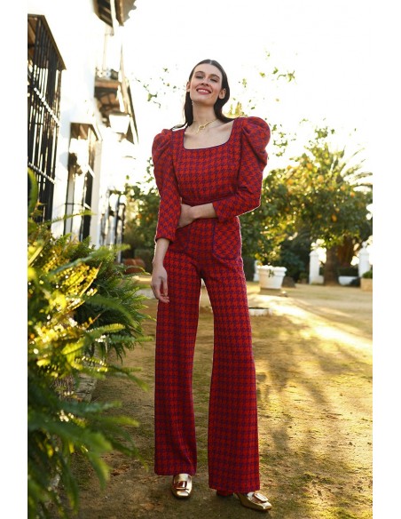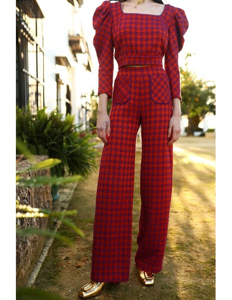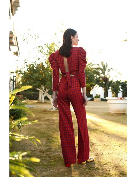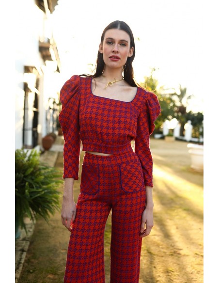 Camisa corta de manga larga con hombros abullonados y un escote cuadrado. Está confeccionada en jacquard estampado de pata de gallo y se cierra con botones. Además, cuenta con una lazada en la espalda que es ajustable y que crea una sutil abertura. Esta prenda combina elementos de estilo como los hombros abullonados y el escote cuadrado con un toque de elegancia gracias al jacquard estampado, lo que la convierte en una opción interesante para diversos looks.