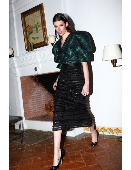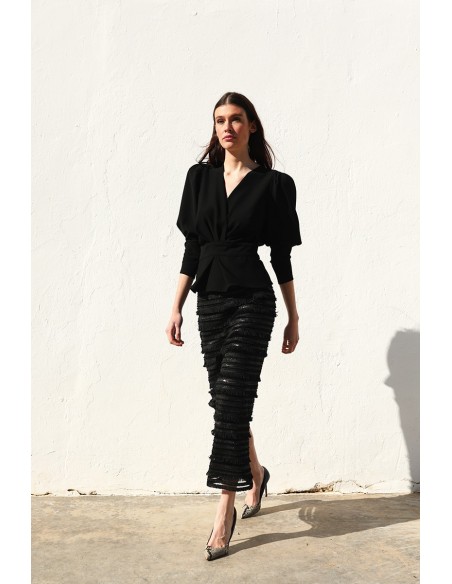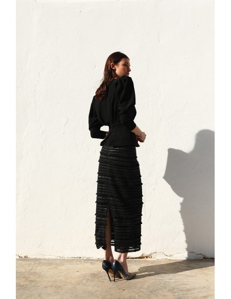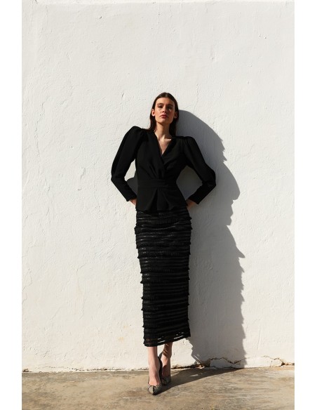 Falda midi de corte recto que se ajusta a la cintura y las caderas, con tiro alto y una abertura en la parte posterior. Esta falda está adornada con flecos y lentejuelas, lo que la convierte en una de las piezas más espectaculares de la colección.