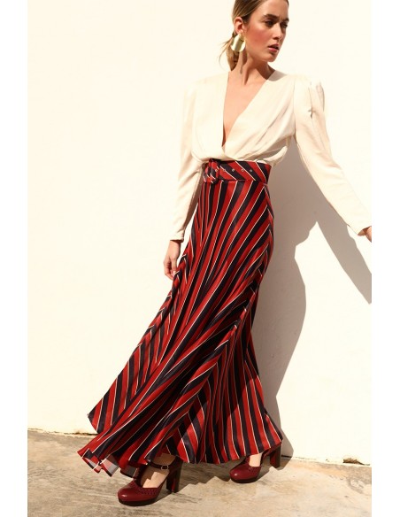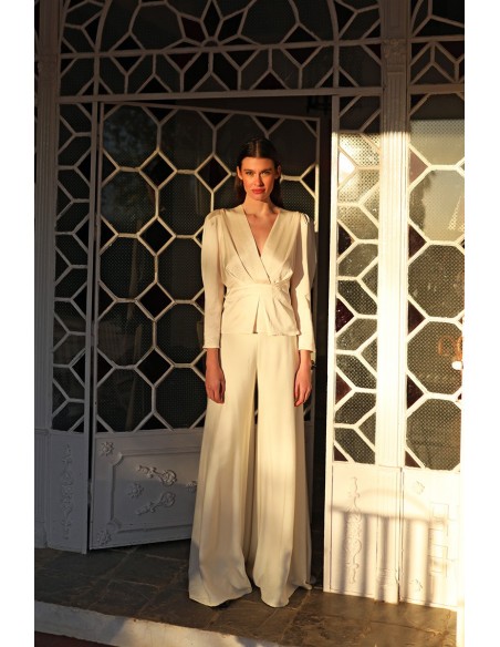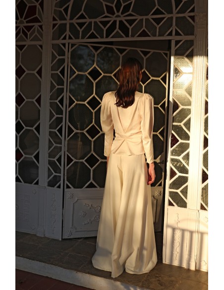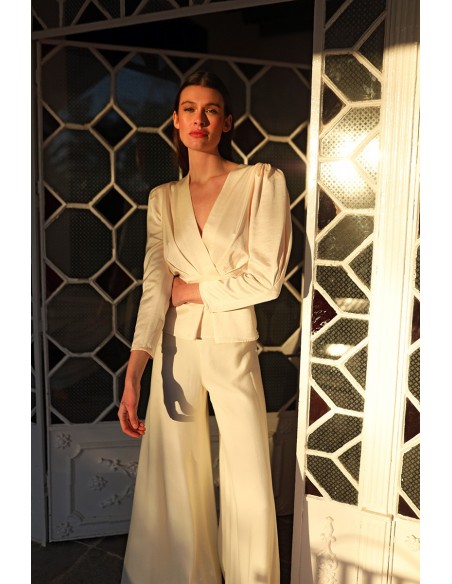 Camisa confeccionada en satén de viscosa. Tiene un diseño cruzado con un escote en pico, mangas abullonadas y puños largos entallados. Además, presenta pinzas en la cintura tanto en la parte delantera como en la parte trasera. Esta camisa combina elementos de estilo elegante y detalles estructurados, lo que la convierte en una prenda sofisticada y favorecedora para diversas ocasiones.