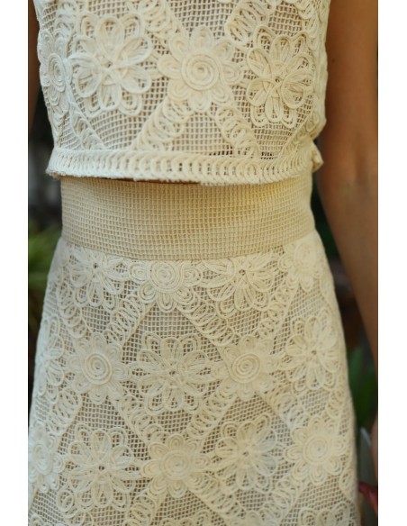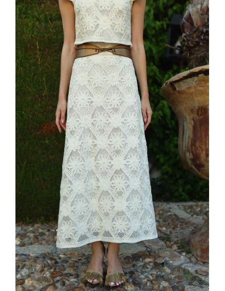 Esta falda evasé midi de guipur marfil es una pieza clave para un look elegante y coordinado. Confeccionada en el mismo guipur que la camisa, crea un conjunto armonioso. Su cinturilla ancha y cierre de cremallera invisible realzan la figura y brindan comodidad, mientras que el guipur aporta un toque de delicadeza. Versátil para eventos formales o looks relajados con sandalias planas.