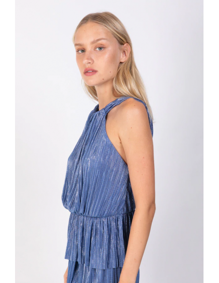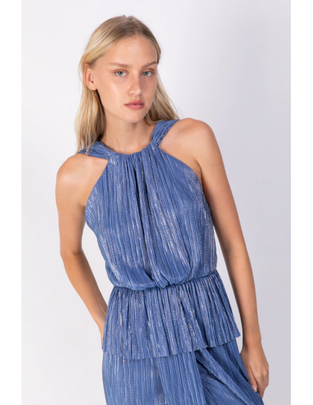 Top de punto plisado con cuello metalizado y espalda abierta exclusiva. Destaca por los dos tirantes que crean un cuello y una espalda creando un efecto especial que junto a la falda a juego parece que forman el mismo conjunto.