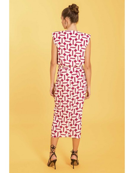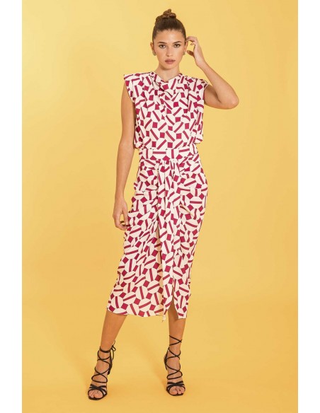 Falda midi hecha en estampado geométrico de viscosa con detalle de recogido en delantero. Esta falda destaca por si efecto drapeado y por la facilidad de combinarse con otras prendas dando un toque muy elegante a tu look.