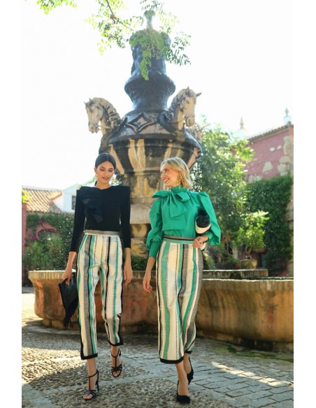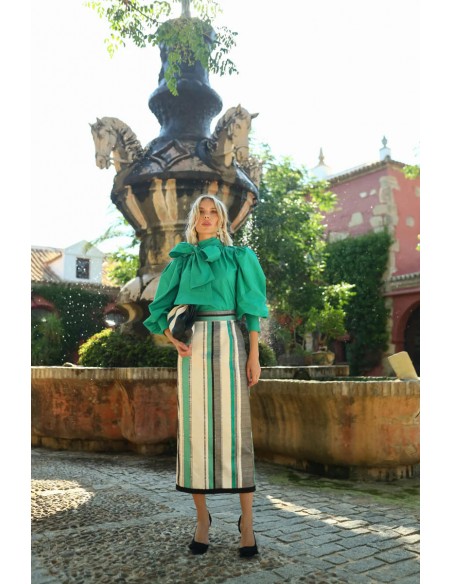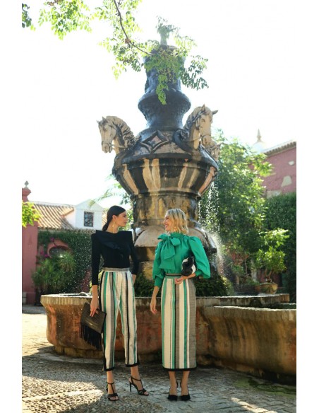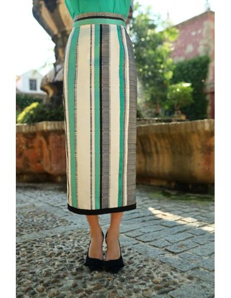 Esta falda midi de estampado de rayas es una pieza clave para un look elegante y sofisticado. Confeccionada en un tejido de alta calidad, ofrece una caída fluida y un detalle de flecos en el bajo que le da un toque distintivo. Perfecta para combinar con blusas estructuradas o tops delicados y elevar cualquier look con distinción.