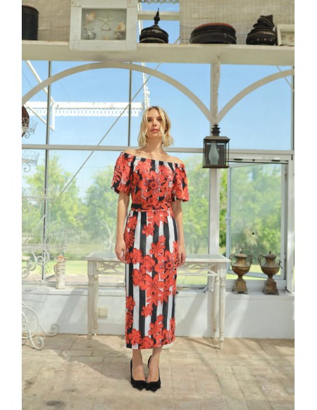 Con un corte midi que estiliza la silueta, esta falda se adapta a múltiples ocasiones, desde eventos de día hasta cenas o celebraciones especiales. El estampado floral y colorido transmite frescura, mientras que su confección en un tejido ligero y fluido asegura una caída elegante y una comodidad absoluta.