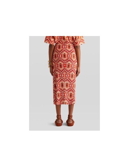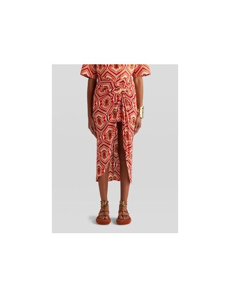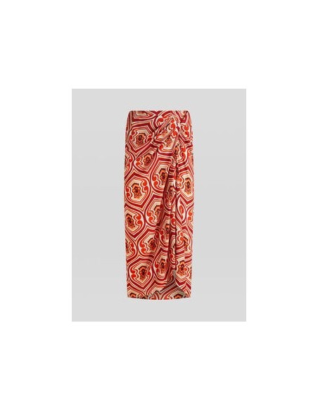 Falda pareo de corte regular. Esta realizada con drapeado delantero y con cierre trasero con cremallera y gancho metálico. Destaca su estampado gráfico inspirado en los años 70.