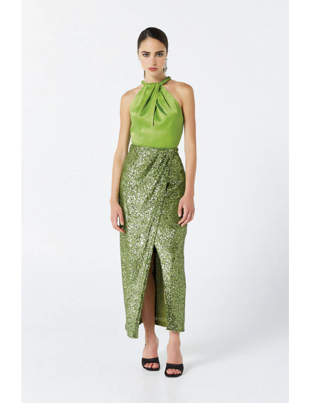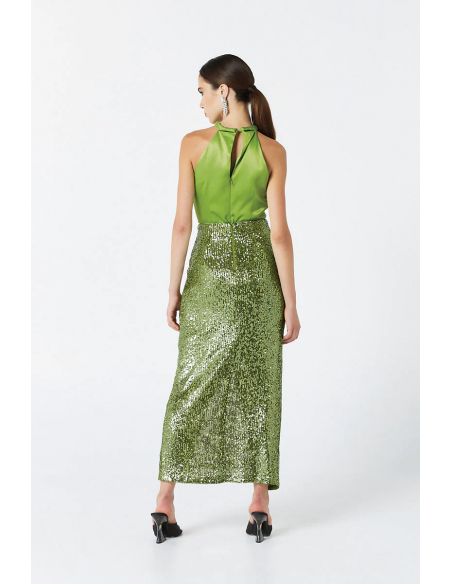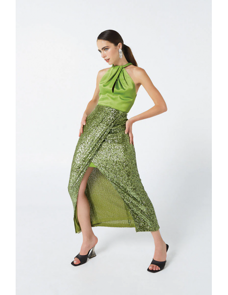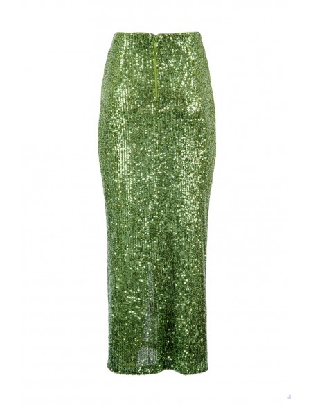 La nueva falda que es la elección perfecta para llevar en una fiesta este verano. Esta falda es una prenda deslumbrante que combina estilo y glamour. El detalle del spacco sul davanti agrega un toque de sensualidad y dinamismo al diseño. Las lentejuelas le dan a la falda un brillo y una apariencia llamativa, perfecta para ocasiones especiales o eventos festivos.