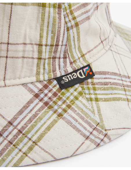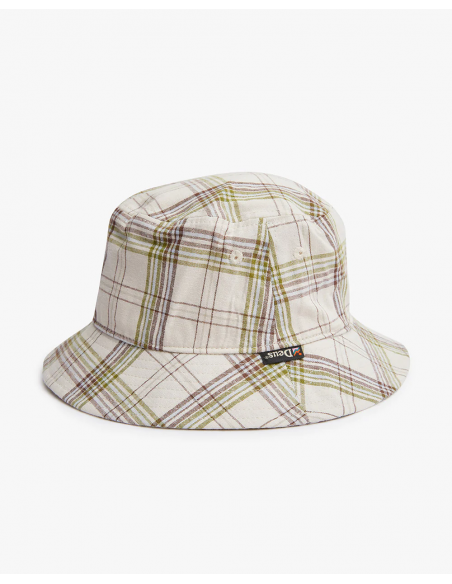 Este sombrero de cubo de cuadros Madras presenta una etiqueta de marca en el lateral y está forrado con una lámina de algodón. El estampado de cuadros Madras le confiere un estilo distintivo y vibrante. La etiqueta de marca añade un toque de autenticidad y estilo.