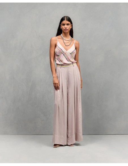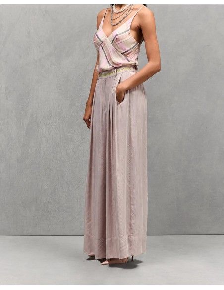 El pantalón Moda de Mes Demoiselles combina un tejido cupro fluido y sedoso con un patrón de rayas Borsalino, ofreciendo un look elegante y moderno. Su corte ancho, las pinzas delanteras y los bolsillos laterales aportan volumen sin perder el estilo. El detalle en vivo fluorescente en la cintura añade un contraste actual a una prenda atemporal.