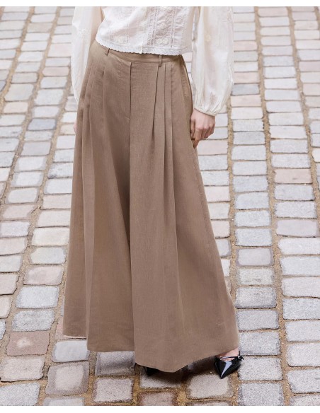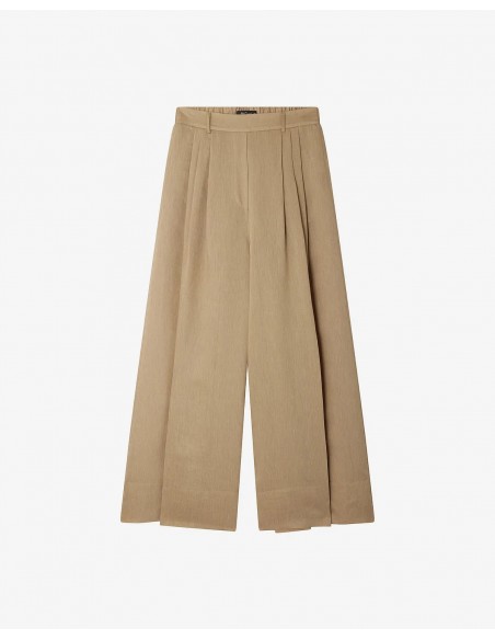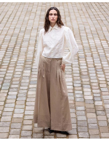 Confeccionado en una mezcla de lyocell y lino, el pantalón Sissy es ligero, fluido y perfecto para los días cálidos. Su corte amplio y ligeramente acampanado se completa con pliegues elegantes y una cintura elástica cómoda, mientras el efecto ligeramente translúcido del tejido añade un toque sensual.