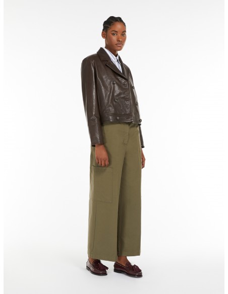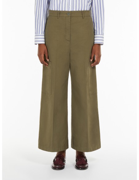 El pantalón Quiz de Weekend Max Mara de inspiración workwear está confeccionado en lona de puro algodón. Presenta una silueta holgada con corte cropped al tobillo, ideal para un look urbano actual. Incorpora maxibolsillos de parche en la pernera, bolsillos franceses laterales y uno trasero con solapa y botón. El cierre de cintura alta y la raya planchada añaden estructura sin perder comodidad.