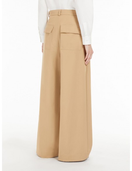Pantalón de pierna ancha en gabardina de algodón puro, con pliegues frontales marcados y detalles de bolsillos con solapa en la parte trasera. De talle alto, con cierre de cremallera oculta y botón. Diseño estructurado y elegante, ideal para el día a día.