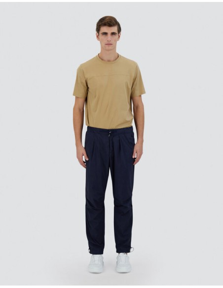 Diseñado con un corte regular, presenta detalles como pinzas delanteras, cintura elástica con cordón de ajuste, cierre con cremallera y botón, bolsillos franceses y bolsillos de parche traseros. El cordón en los tobillos permite personalizar el ajuste y aporta un aire moderno e informal.