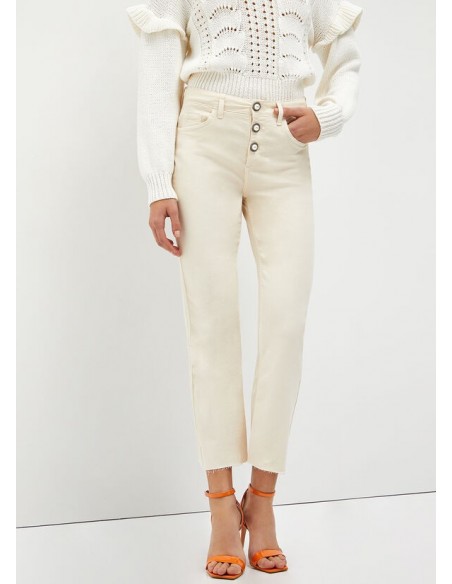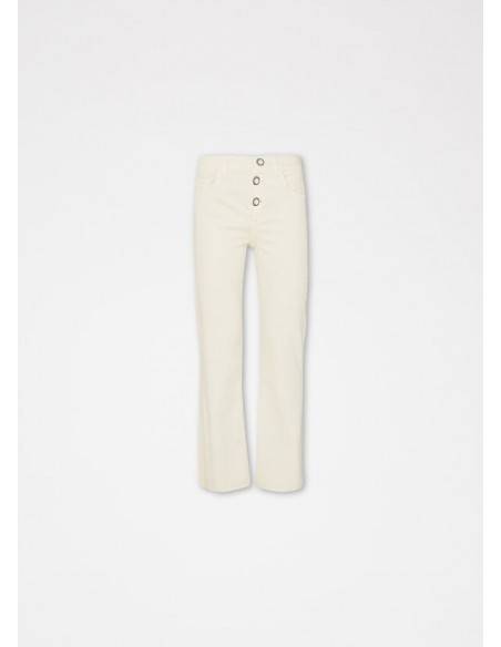 Están confeccionados en denim de algodón elástico con pinza marcada. Cuentan con pernera entallada que se ensancha en el bajo y como elemento diferenciador de los demas cuenta con cierre con botones a la vista.