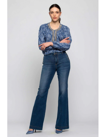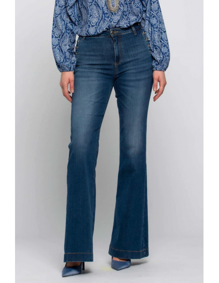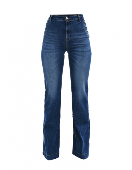 Jeans acampanados con detalle de botones en los laterales. Se pueden combinar con un top entallado y una americana y se llevan tanto para una cena con amigas como para el día a día.