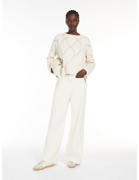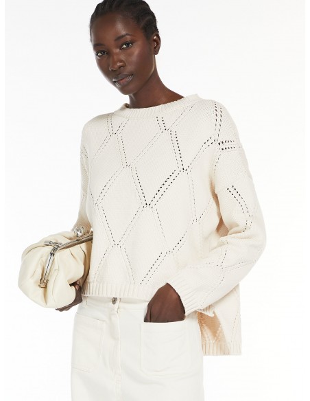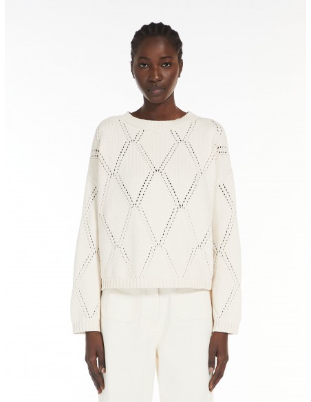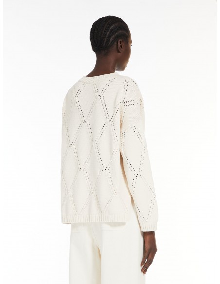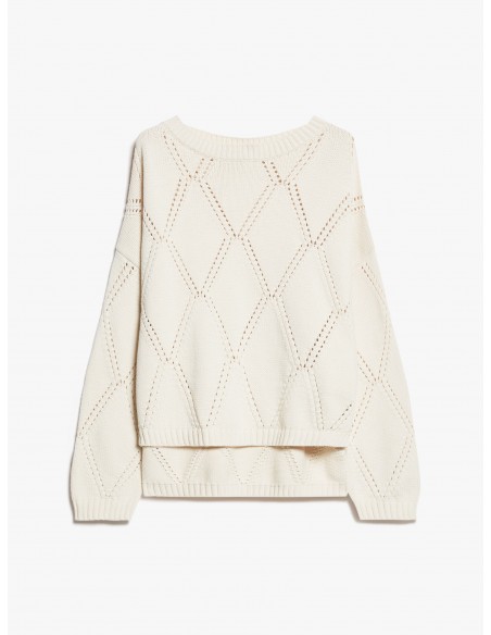 Jersey de cuello redondo y corte holgado, confeccionado en algodón y decorado con un exclusivo estampado de rombos troquelados. Este modelo cuenta con mangas largas, sisa caída, y un bajo asimétrico que se alarga en la parte trasera, con elegantes aberturas laterales. Los ribetes acanalados completan el diseño, añadiendo un toque de textura y sofisticación.