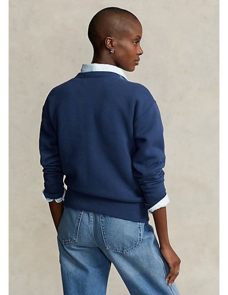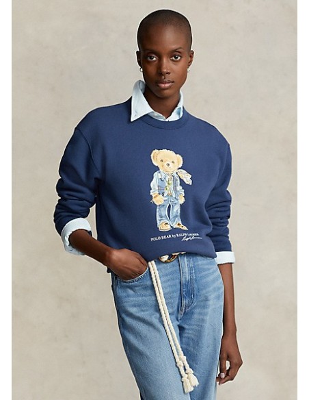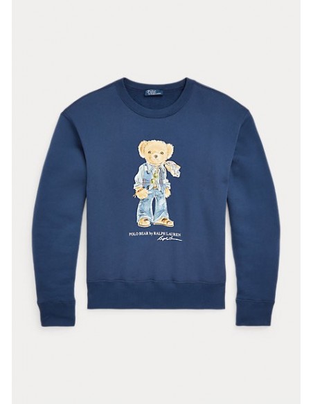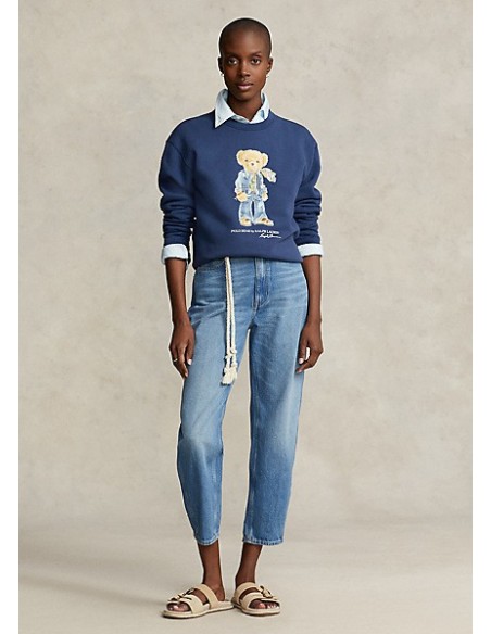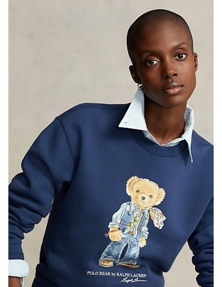 Esta sudadera holgada con felpa de mezcla de algodón presenta un estampado y bordado de nuestro querido Polo Bear vestido con una bufanda con estampado floral, una camisa con tachuelas, un chaleco vaquero, jeans acampanados y sandalias.