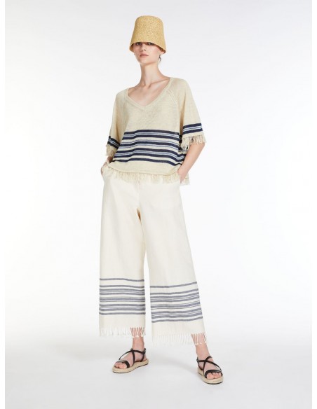 No te pierdas este suéter corto confeccionado en un tejido de lino, presentando un estilo de corte holgado y amplio. El escote en forma de V está terminado con un ribete de punto elástico, mientras que las mangas raglán tienen un acabado francés.