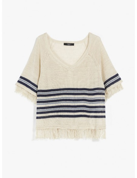 Los bordes del jersey, tanto en el bajo de la manga como en la prenda en sí, están adornados con flecos, agregando un toque de estilo y movimiento. Este detalle distintivo añade un toque bohemio y llamativo al conjunto.