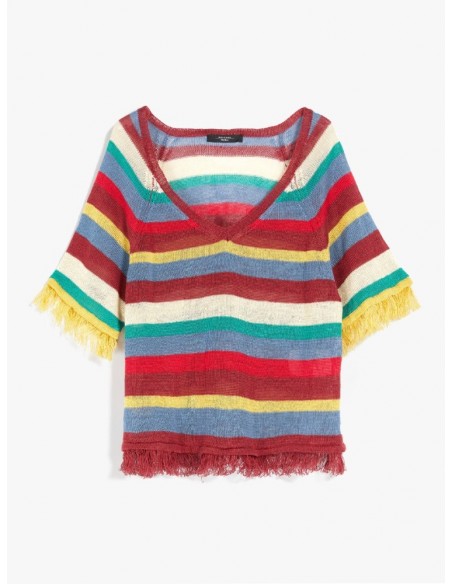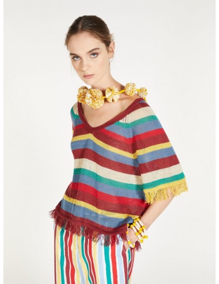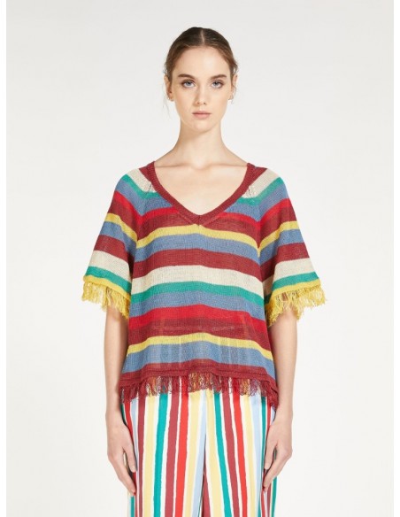 Los bordes del jersey, tanto en el bajo de la manga como en la prenda en sí, están adornados con flecos, agregando un toque de estilo y movimiento. Este detalle distintivo añade un toque bohemio y llamativo al conjunto.