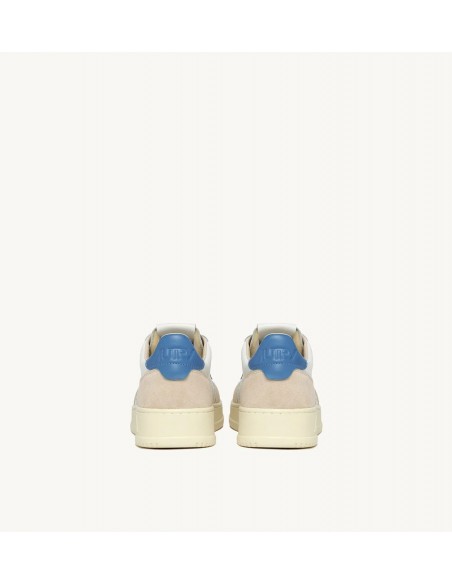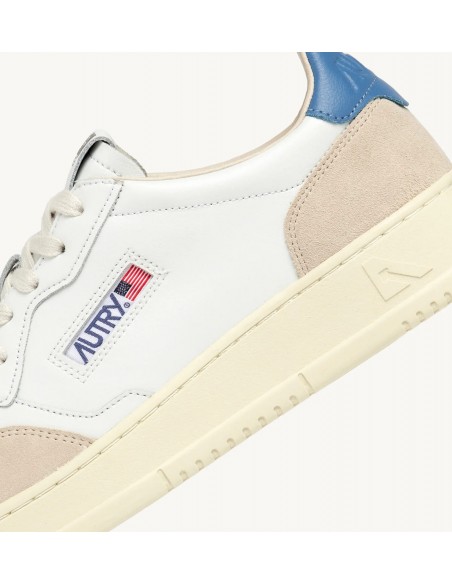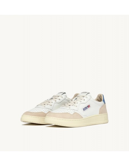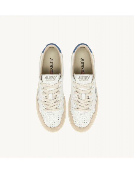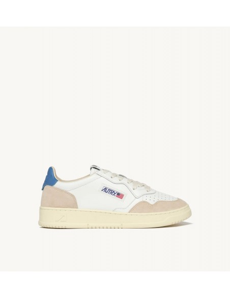 Autry Medalist, inspiradas en el diseño vintage de los años 80 y reinterpretadas con un toque moderno, son zapatillas bajas de estilo vintage. La parte superior combina cuero blanco y ante, con el icónico logo grabado en un llamativo parche trasero en color azul. Estas zapatillas destacan por su elegancia clásica y detalles como la puntera perforada, cordones de algodón plano, y el cuello acolchado.