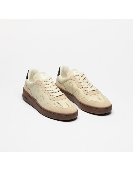 Las Veja V-90 Leather Beige Almond Black son una edición exclusiva creada en colaboración con Centre Commercial, donde se fusionan estética y sostenibilidad. Estas zapatillas incorporan cuero Trazado Orgánico (O.T.), proveniente de granjas 100% orgánicas certificadas en Uruguay, combinado con paneles de ante y cuero O.T. que aportan un acabado sofisticado. La plantilla está fabricada con caucho del Amazonas, E.V.A. de origen biológico y reciclado, algodón orgánico y otros materiales, mientras que la suela exterior combina caucho de Amazonía, sílice mineral, caucho reciclado, caucho sintético y otros compuestos. El forro es de poliéster reciclado y los cordones están hechos de algodón biológico. Producidas en Brasil, estas zapatillas destacan por su calidad, uso de tintes de bajo impacto y procesos responsables que minimizan el consumo de agua.